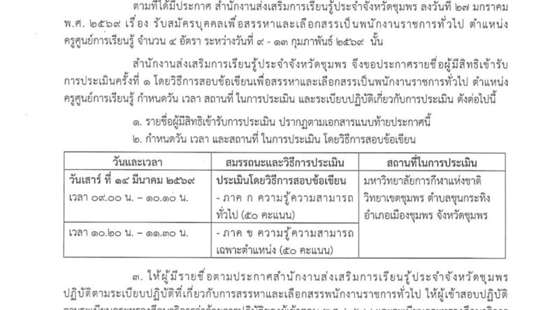 ประกาศสำนักงานส่งเสริมการเรียนรู้ประจำจังหวัดชุมพร เรื่อง 📋 รายชื่อผู้มีสิทธิเข้ารับการประเมินครั้งที่ 1 โดยวิธีการสอบข้อเขียน เพื่อสรรหาและเลือกสรรเป็นพนักงานราชการทั่วไป 📌 ตำแหน่ง ครูศูนย์การเรียนรู้ 🔎 ผู้สมัครสามารถตรวจสอบรายชื่อ และรายละเอียดเพิ่มเติมเกี่ยวกับวัน เวลา และสถานที่ในการประเมิน