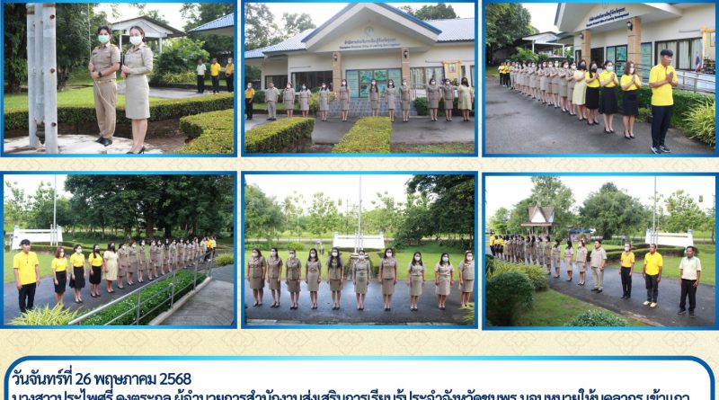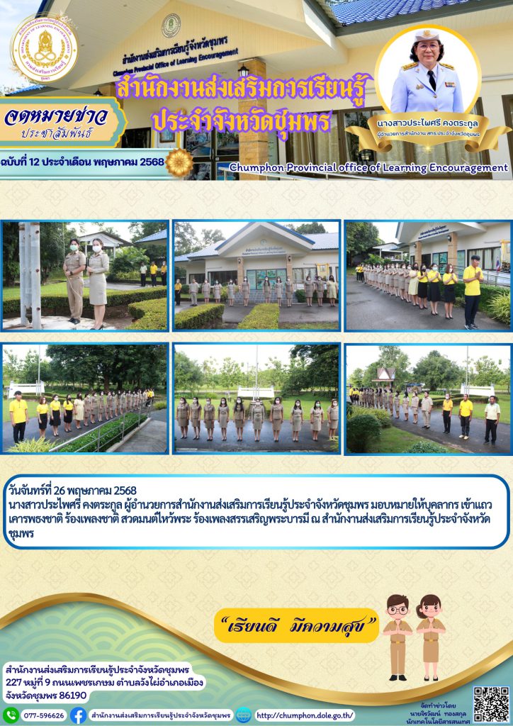 วันจันทร์ที่ 26 พฤษภาคม 2568 นางสาวประไพศรี คงตระกูล ผู้อำนวยการสำนักงานส่งเสริมการเรียนรู้ประจำจังหวัดชุมพร มอบหมายให้บุคลากร เข้าแถวเคารพธงชาติ ร้องเพลงชาติ สวดมนต์ไหว้พระ ร้องเพลงสรรเสริญพระบารมี ณ สำนักงานส่งเสริมการเรียนรู้ประจำจังหวัดชุมพร