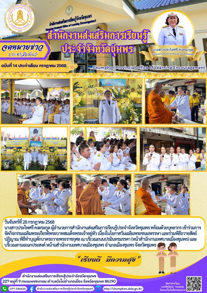 วันจันทร์ที่ 28 กรกฎาคม 2568 นางสาวประไพศรี คงตระกูล ผู้อำนวยการสำนักงานส่งเสริมการเรียนรู้ประจำจังหวัดชุมพร พร้อมด้วยบุคลากร เข้าร่วมการจัดกิจกรรมเฉลิมพระเกียรติพระบาทสมเด็จพระเจ้าอยู่หัว เนื่องในโอกาสวันเฉลิมพระชนมพรรษา และร่วมพิธีถวายสัตย์ปฏิญาณ พิธีทำบุญตักบาตรถวายพระราชกุศล ณ บริเวณถนนปรมินทรมรรคา (หน้าสำนักงานเทศบาลเมืองชุมพร) และบริเวณลานอเนกประสงค์ หน้านสำนักงานเทศบาลเมืองชุมพร อำเภอเมืองชุมพร จังหวัดชุมพร