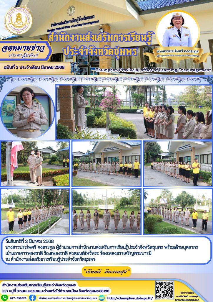 วันจันทร์ที่ 3 มีนาคม 2568 นางสาวประไพศรี คงตระกูล ผู้อำนวยการสำนักงานส่งเสริมการเรียนรู้ประจำจังหวัดชุมพร พร้อมด้วยบุคลากร เข้าแถวเคารพธงชาติ ร้องเพลงชาติ สวดมนต์ไหว้พระ ร้องเพลงสรรเสริญพระบารมี ณ สำนักงานส่งเสริมการเรียนรู้ประจำจังหวัดชุมพร