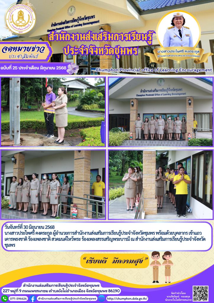 วันจันทร์ที่ 30 มิถุนายน 2568 นางสาวประไพศรี คงตระกูล ผู้อำนวยการสำนักงานส่งเสริมการเรียนรู้ประจำจังหวัดชุมพร พร้อมด้วยบุคลากร เข้าแถวเคารพธงชาติ ร้องเพลงชาติ สวดมนต์ไหว้พระ ร้องเพลงสรรเสริญพระบารมี ณ สำนักงานส่งเสริมการเรียนรู้ประจำจังหวัดชุมพร
