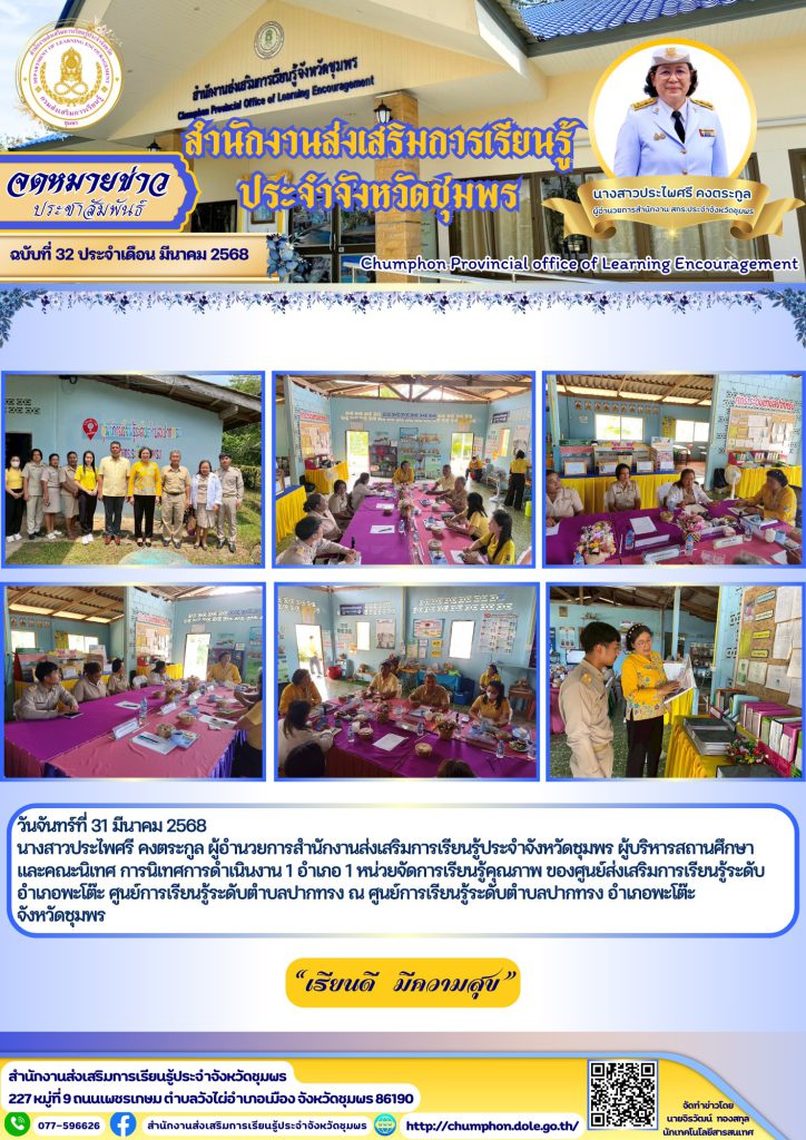 วันจันทร์ที่ 31 มีนาคม 2568 นางสาวประไพศรี คงตระกูล ผู้อำนวยการสำนักงานส่งเสริมการเรียนรู้ประจำจังหวัดชุมพร ผู้บริหารสถานศึกษา และคณะนิเทศ การนิเทศการดำเนินงาน 1 อำเภอ 1 หน่วยจัดการเรียนรู้คุณภาพ ของศูนย์ส่งเสริมการเรียนรู้ระดับอำเภอพะโต๊ะ ศูนย์การเรียนรู้ระดับตำบลปากทรง ณ ศูนย์การเรียนรู้ระดับตำบลปากทรง อำเภอพะโต๊ะ จังหวัดชุมพร