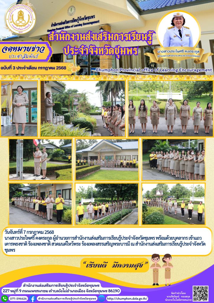 วันจันทร์ที่ 7 กรกฎาคม 2568 นางสาวประไพศรี คงตระกูล ผู้อำนวยการสำนักงานส่งเสริมการเรียนรู้ประจำจังหวัดชุมพร พร้อมด้วยบุคลากร เข้าแถวเคารพธงชาติ ร้องเพลงชาติ สวดมนต์ไหว้พระ ร้องเพลงสรรเสริญพระบารมี ณ สำนักงานส่งเสริมการเรียนรู้ประจำจังหวัดชุมพร