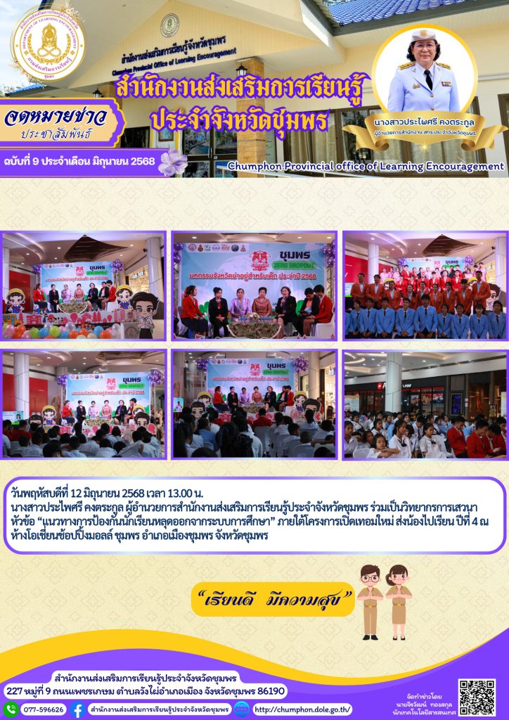 วันพฤหัสบดีที่ 12 มิถุนายน 2568 เวลา 13.00 น. นางสาวประไพศรี คงตระกูล ผู้อำนวยการสำนักงานส่งเสริมการเรียนรู้ประจำจังหวัดชุมพร ร่วมเป็นวิทยากรการเสวนา หัวข้อ “แนวทางการป้องกันนักเรียนหลุดออกจากระบบการศึกษา” ภายใต้โครงการเปิดเทอมใหม่ ส่งน้องไปเรียน ปีที่ 4 ณ ห้างโอเชี่ยนช้อปปิ้งมอลล์ ชุมพร อำเภอเมืองชุมพร จังหวัดชุมพร