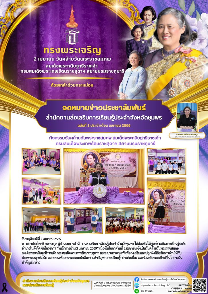 วันพฤหัสบดีที่ 2 เมษายน 2569 นางสาวประไพศรี คงตระกูล ผู้อำนวยการสำนักงานส่งเสริมการเรียนรู้ประจำจังหวัดชุมพร ได้ส่งเสริมให้ศูนย์ส่งเสริมการเรียนรู้ระดับอำเภอในสังกัด จัดโครงการ “วันรักการอ่าน 2 เมษายน 2569” เนื่องในโอกาสวันที่ 2 เมษายน ซึ่งเป็นวันคล้ายวันพระราชสมภพ สมเด็จพระกนิษฐาธิราชเจ้า กรมสมเด็จพระเทพรัตนราชสุดาฯ สยามบรมราชกุมารี เพื่อส่งเสริมและปลูกฝังนิสัยรักการอ่านให้กับประชาชนทุกช่วงวัย ตลอดจนสร้างความตระหนักถึงความสำคัญของการเรียนรู้อย่างต่อเนื่อง และร่วมเทิดพระเกียรติในโอกาสวันสำคัญดังกล่าว