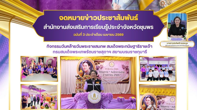 นางสาวประไพศรี คงตระกูล ผู้อำนวยการสำนักงานส่งเสริมการเรียนรู้ประจำจังหวัดชุมพร ได้ส่งเสริมให้ศูนย์ส่งเสริมการเรียนรู้ระดับอำเภอในสังกัด จัดโครงการ “วันรักการอ่าน 2 เมษายน 2569” เนื่องในโอกาสวันที่ 2 เมษายน ซึ่งเป็นวันคล้ายวันพระราชสมภพ สมเด็จพระกนิษฐาธิราชเจ้า กรมสมเด็จพระเทพรัตนราชสุดาฯ สยามบรมราชกุมารี เพื่อส่งเสริมและปลูกฝังนิสัยรักการอ่านให้กับประชาชนทุกช่วงวัย ตลอดจนสร้างความตระหนักถึงความสำคัญของการเรียนรู้อย่างต่อเนื่อง และร่วมเทิดพระเกียรติในโอกาสวันสำคัญดังกล่าว