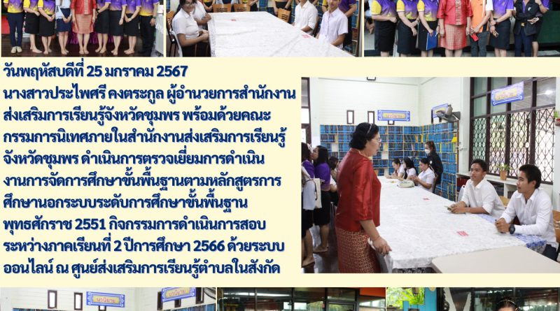 วันพฤหัสบดีที่ 25 มกราคม 2567 นางสาวประไพศรี คงตระกูล ผู้อำนวยการสำนักงานส่งเสริมการเรียนรู้จังหวัดชุมพร พร้อมด้วยคณะกรรมการนิเทศภายในสำนักงานส่งเสริมการเรียนรู้จังหวัดชุมพร ดำเนินการตรวจเยี่ยมการดำเนินงานการจัดการศึกษาขั้นพื้นฐานตามหลักสูตรการศึกษานอกระบบระดับการศึกษาขั้นพื้นฐาน พุทธศักราช 2551 กิจกรรมการดำเนินการสอบระหว่างภาคเรียนที่ 2 ปีการศึกษา 2566 ด้วยระบบออนไลน์ ณ ศูนย์ส่งเสริมการเรียนรู้ตำบลในสังกัด