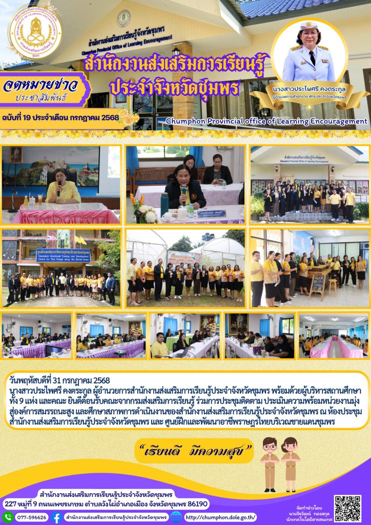 วันพฤหัสบดีที่ 31 กรกฎาคม 2568 นางสาวประไพศรี คงตระกูล ผู้อำนวยการสำนักงานส่งเสริมการเรียนรู้ประจำจังหวัดชุมพร พร้อมด้วยผู้บริหารสถานศึกษาทั้ง 9 แห่ง และคณะ ยินดีต้อนรับคณะจากกรมส่งเสริมการเรียนรู้ ร่วมการประชุมติดตาม ประเมินความพร้อมหน่วยงานมุ่งสู่องค์การสมรรถนะสูง และศึกษาสภาพการดำเนินงานของสำนักงานส่งเสริมการเรียนรู้ประจำจังหวัดชุมพร ณ ห้องประชุมสำนักงานส่งเสริมการเรียนรู้ประจำจังหวัดชุมพร และ ศูนย์ฝึกและพัฒนาอาชีพราษฎรไทยบริเวณชายแดนชุมพร