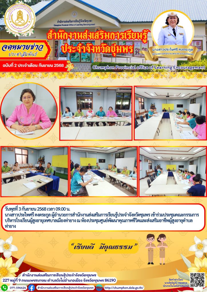 วันพุธที่ 3 กันยายน 2568 เวลา 09.00 น. นางสาวประไพศรี คงตระกูล ผู้อำนวยการสำนักงานส่งเสริมการเรียนรู้ประจำจังหวัดชุมพร เข้าร่วมประชุมคณะกรรมการบริหารโรงเรียนผู้สูงอายุเทศบาลเมืองท่ายาง ณ ห้องประชุมศูนย์พัฒนาคุณภาพชีวิตและส่งเสริมอาชีพผู้สูงอายุตำบลท่ายาง