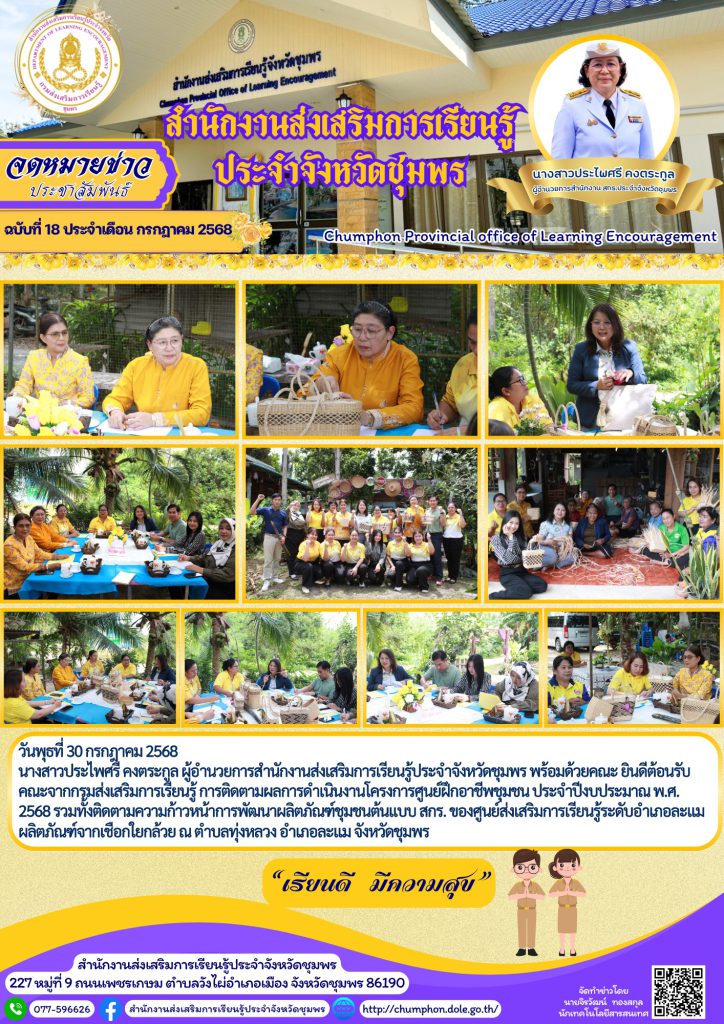 วันพุธที่ 30 กรกฎาคม 2568 นางสาวประไพศรี คงตระกูล ผู้อำนวยการสำนักงานส่งเสริมการเรียนรู้ประจำจังหวัดชุมพร พร้อมด้วยคณะ ยินดีต้อนรับคณะจากกรมส่งเสริมการเรียนรู้ การติดตามผลการดำเนินงานโครงการศูนย์ฝึกอาชีพชุมชน ประจำปีงบประมาณ พ.ศ. 2568 รวมทั้งติดตามความก้าวหน้าการพัฒนาผลิตภัณฑ์ชุมชนต้นแบบ สกร. ของศูนย์ส่งเสริมการเรียนรู้ระดับอำเภอละแม ผลิตภัณฑ์จากเชือกใยกล้วย ณ ตำบลทุ่งหลวง อำเภอละแม จังหวัดชุมพร