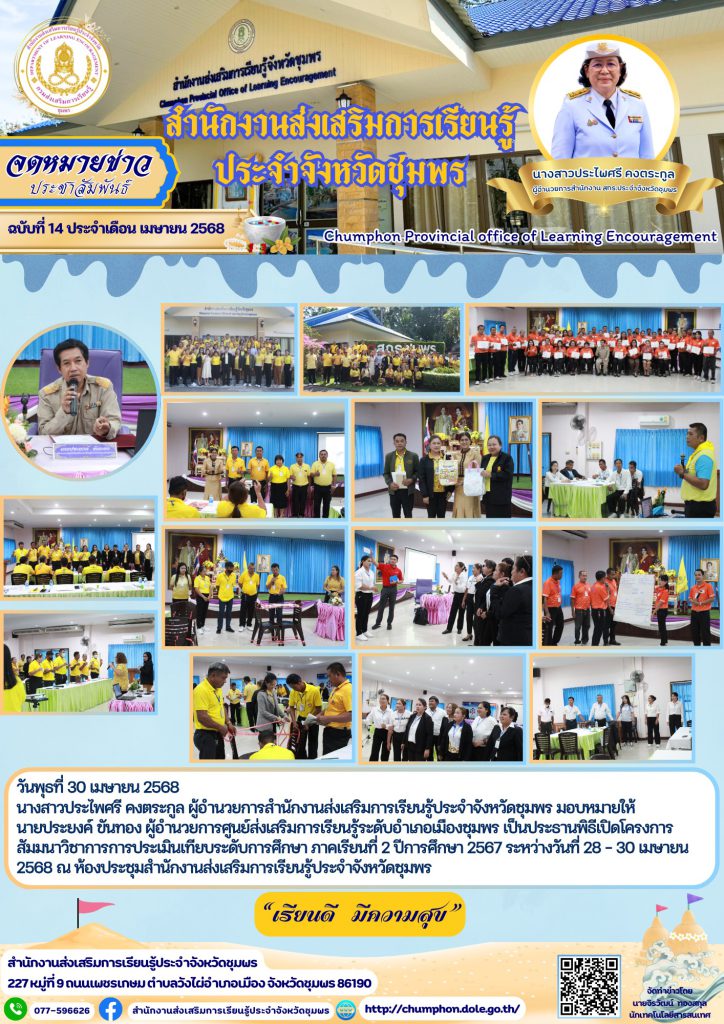 วันพุธที่ 30 เมษายน 2568 นางสาวประไพศรี คงตระกูล ผู้อำนวยการสำนักงานส่งเสริมการเรียนรู้ประจำจังหวัดชุมพร มอบหมายให้ นายประยงค์ ขันทอง ผู้อำนวยการศูนย์ส่งเสริมการเรียนรู้ระดับอำเภอเมืองชุมพร เป็นประธานพิธีเปิดโครงการสัมมนาวิชาการการประเมินเทียบระดับการศึกษา ภาคเรียนที่ 2 ปีการศึกษา 2567 ระหว่างวันที่ 28 – 30 เมษายน 2568 ณ ห้องประชุมสำนักงานส่งเสริมการเรียนรู้ประจำจังหวัดชุมพร