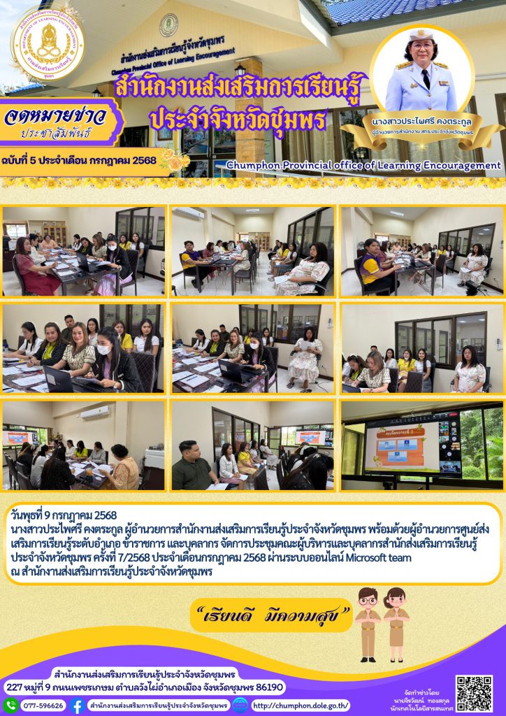 วันพุธที่ 9 กรกฎาคม 2568 นางสาวประไพศรี คงตระกูล ผู้อำนวยการสำนักงานส่งเสริมการเรียนรู้ประจำจังหวัดชุมพร พร้อมด้วยผู้อำนวยการศูนย์ส่งเสริมการเรียนรู้ระดับอำเภอ ข้าราชการ และบุคลากร จัดการประชุมคณะผู้บริหารและบุคลากรสำนักส่งเสริมการเรียนรู้ประจำจังหวัดชุมพร ครั้งที่ 7/2568 ประจำเดือนกรกฎาคม 2568 ผ่านระบบออนไลน์ Microsoft team ณ สำนักงานส่งเสริมการเรียนรู้ประจำจังหวัดชุมพร