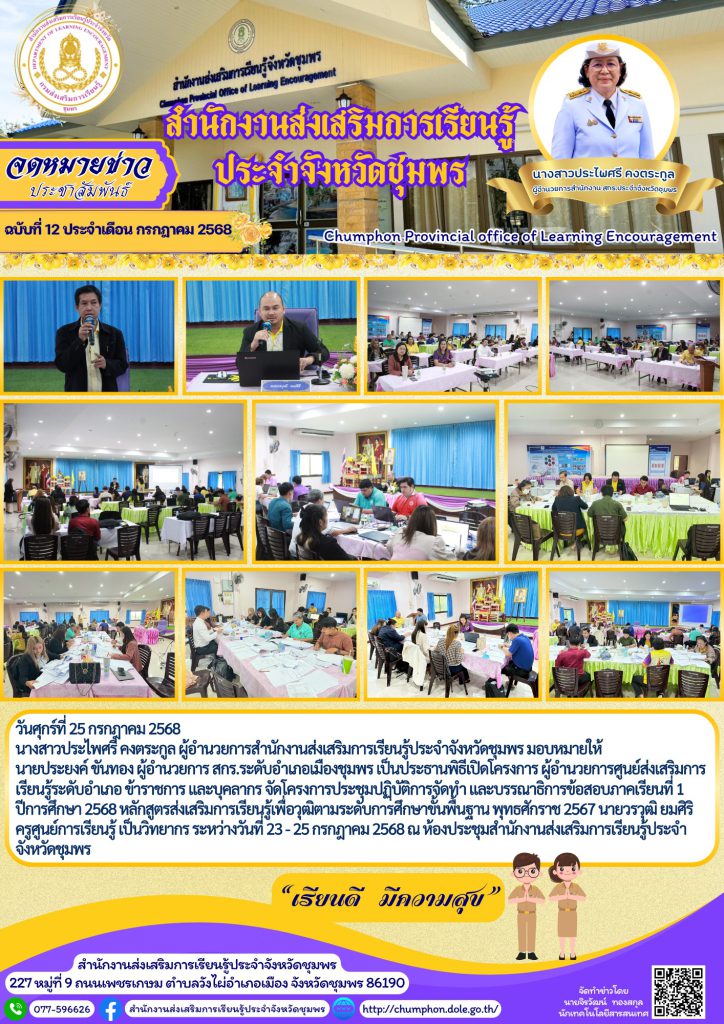 วันศุกร์ที่ 25 กรกฎาคม 2568 นางสาวประไพศรี คงตระกูล ผู้อำนวยการสำนักงานส่งเสริมการเรียนรู้ประจำจังหวัดชุมพร มอบหมายให้ นายประยงค์ ขันทอง ผู้อำนวยการ สกร.ระดับอำเภอเมืองชุมพร เป็นประธานพิธีเปิดโครงการ ผู้อำนวยการศูนย์ส่งเสริมการเรียนรู้ระดับอำเภอ ข้าราชการ และบุคลากร จัดโครงการประชุมปฏฺิบัติการจัดทำ และบรรณาธิการข้อสอบภาคเรียนที่ 1 ปีการศึกษา 2568 หลักสูตรส่งเสริมการเรียนรู้เพื่อวุฒิตามระดับการศึกษาขั้นพื้นฐาน พุทธศักราช 2567 นายวรวุฒิ ยมศิริ ครูศูนย์การเรียนรู้ เป็นวิทยากร ระหว่างวันที่ 23 – 25 กรกฎาคม 2568 ณ ห้องประชุมสำนักงานส่งเสริมการเรียนรู้ประจำจังหวัดชุมพร