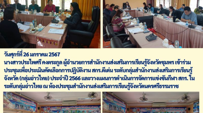 วันศุกร์ที่ 26 มกราคม 2567 นางสาวประไพศรี คงตระกูล ผู้อำนวยการสำนักงานส่งเสริมการเรียนรู้จังหวัดชุมพร เข้าร่วมประชุมเพื่อประเมินคัดเลือกการปฏิบัติงาน สกร.ดีเด่น ระดับกลุ่มสำนักงานส่งเสริมการเรียนรู้จังหวัด (กลุ่มอ่าวไทย) ประจำปี 2566 และวางแผนการดำเนินการจัดการแข่งขันกีฬา สกร. ในระดับกลุ่มอ่าวไทย ณ ห้องประชุมสำนักงานส่งเสริมการเรียนรู้จังหวัดนครศรีธรรมราช
