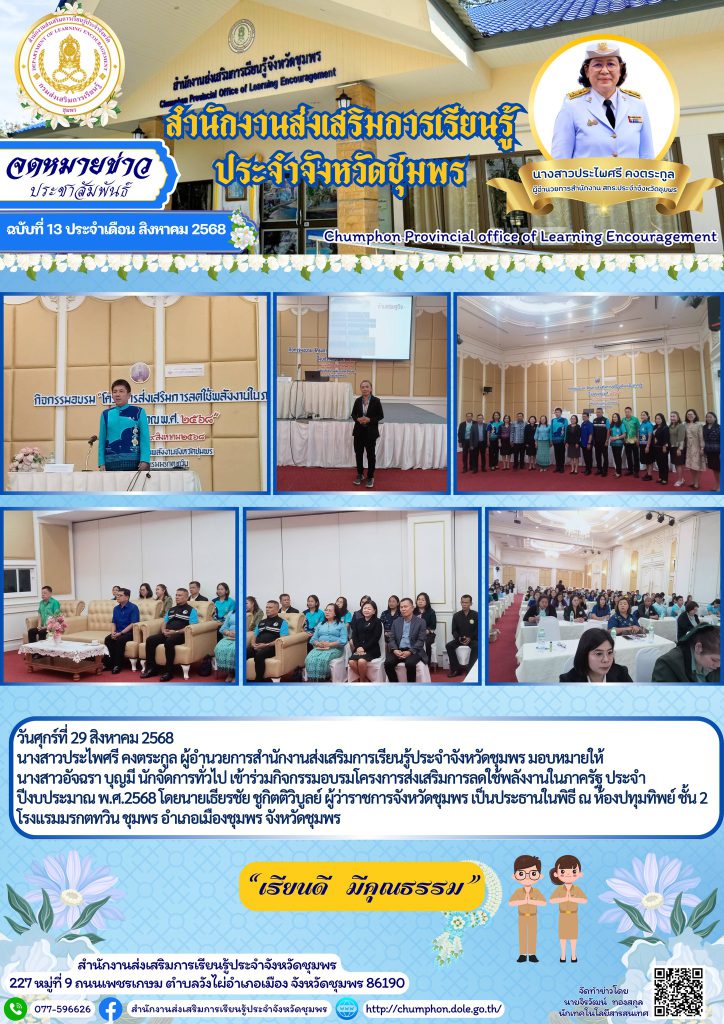 วันศุกร์ที่ 29 สิงหาคม 2568 นางสาวประไพศรี คงตระกูล ผู้อำนวยการสำนักงานส่งเสริมการเรียนรู้ประจำจังหวัดชุมพร มอบหมายให้ นางสาวอัจฉรา บุญมี นักจัดการทั่วไป เข้าร่วมกิจกรรมอบรมโครงการส่งเสริมการลดใช้พลังงานในภาครัฐ ประจำปีงบประมาณ พ.ศ.2568 โดยนายเธียรชัย ชูกิตติวิบูลย์ ผู้ว่าราชการจังหวัดชุมพร เป็นประธานในพิธี ณ ห้องปทุมทิพย์ ชั้น 2 โรงแรมมรกตทวิน ชุมพร อำเภอเมืองชุมพร จังหวัดชุมพร