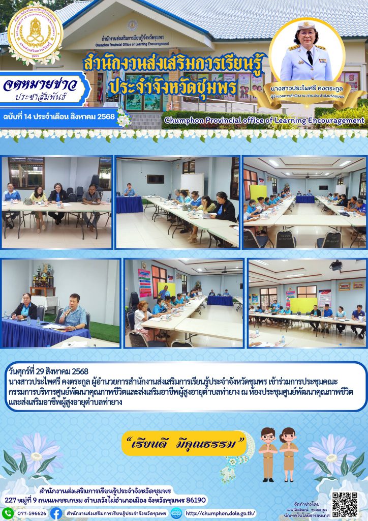 วันศุกร์ที่ 29 สิงหาคม 2568 นางสาวประไพศรี คงตระกูล ผู้อำนวยการสำนักงานส่งเสริมการเรียนรู้ประจำจังหวัดชุมพร เข้าร่วมการประชุมคณะกรรมการบริหารศูนย์พัฒนาคุณภาพชีวิตและส่งเสริมอาชีพผู้สูงอายุตำบลท่ายาง ณ ห้องประชุมศูนย์พัฒนาคุณภาพชีวิตและส่งเสริมอาชีพผู้สูงอายุตำบลท่ายาง