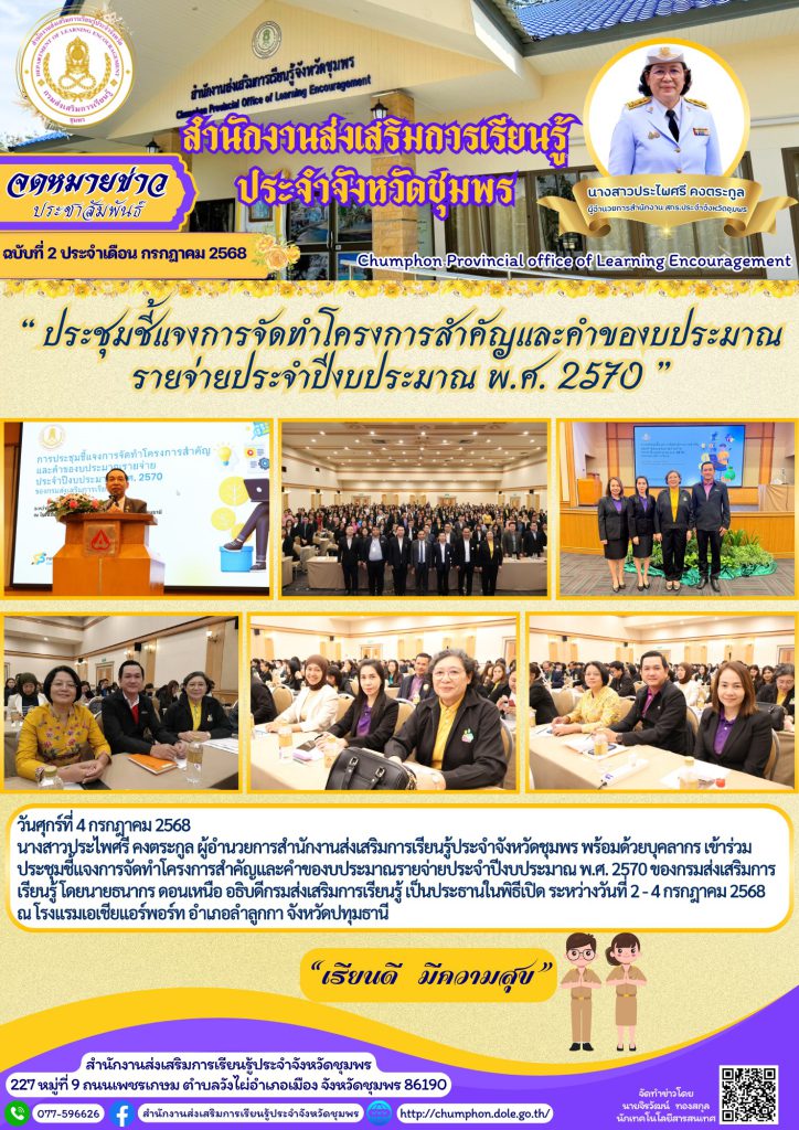 วันศุกร์ที่ 4 กรกฎาคม 2568 นางสาวประไพศรี คงตระกูล ผู้อำนวยการสำนักงานส่งเสริมการเรียนรู้ประจำจังหวัดชุมพร พร้อมด้วยบุคลากร เข้าร่วมประชุมชี้แจงการจัดทำโครงการสำคัญและคำของบประมาณรายจ่ายประจำปีงบประมาณ พ.ศ. 2570 ของกรมส่งเสริมการเรียนรู้ โดยนายธนากร ดอนเหนือ อธิบดีกรมส่งเสริมการเรียนรู้ เป็นประธานในพิธีเปิด ระหว่างวันที่ 2 – 4 กรกฎาคม 2568 ณ โรงแรมเอเชียแอร์พอร์ท อำเภอลำลูกกา จังหวัดปทุมธานี