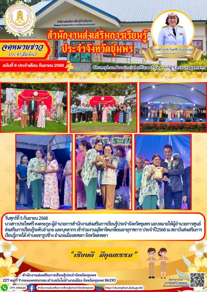 วันศุกร์ที่ 5 กันยายน 2568 นางสาวประไพศรี คงตระกูล ผู้อำนวยการสำนักงานส่งเสริมการเรียนรู้ประจำจังหวัดชุมพร มอบหมายให้ผู้อำนวยการศูนย์ส่งเสริมการเรียนรู้ระดับอำเภอ และบุคลากร เข้าร่วมงานมุธิตาจิตเกษียณอายุราชการ ประจำปี2568 ณ สถาบันส่งเสริมการเรียนรู้ภาคใต้ ตำบลเขารูปช้าง อำเภอเมืองสงขลา จังหวัดสงขลา