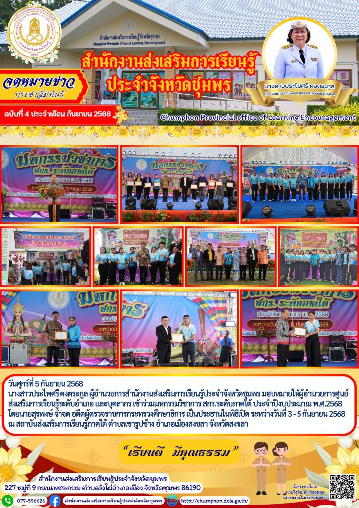 วันศุกร์ที่ 5 กันยายน 2568 นางสาวประไพศรี คงตระกูล ผู้อำนวยการสำนักงานส่งเสริมการเรียนรู้ประจำจังหวัดชุมพร มอบหมายให้ผู้อำนวยการศูนย์ส่งเสริมการเรียนรู้ระดับอำเภอ และบุคลากร เข้าร่วมมหกรรมวิชาการ สกร.ระดับภาคใต้ ประจำปีงบประมาณ พ.ศ.2568 โดยนายสุรพงษ์ จำจด อดีตผู้ตรวจราชการกระทรวงศึกษาธิการ เป็นประธานในพิธีเปิด ระหว่างวันที่ 3 – 5 กันยายน 2568 ณ สถาบันส่งเสริมการเรียนรู้ภาคใต้ ตำบลเขารูปช้าง อำเภอเมืองสงขลา จังหวัดสงขลา