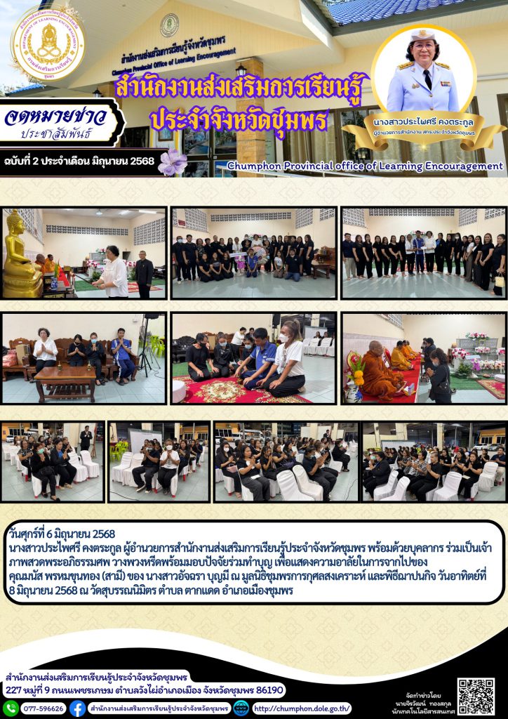 วันศุกร์ที่ 6 มิถุนายน 2568 นางสาวประไพศรี คงตระกูล ผู้อำนวยการสำนักงานส่งเสริมการเรียนรู้ประจำจังหวัดชุมพร พร้อมด้วยบุคลากร ร่วมเป็นเจ้าภาพสวดพระอภิธรรมศพ วางพวงหรีดพร้อมมอบปัจจัยร่วมทำบุญ เพื่อแสดงความอาลัยในการจากไปของ คุณมนัส พรหมขุนทอง (สามี) ของ นางสาวอัจฉรา บุญมี ณ มูลนิธิชุมพรการกุศลสงเคราะห์ และพิธีฌาปนกิจ วันอาทิตย์ที่ 8 มิถุนายน 2568 ณ วัดสุบรรณนิมิตร ตำบล ตากแดด อำเภอเมืองชุมพร