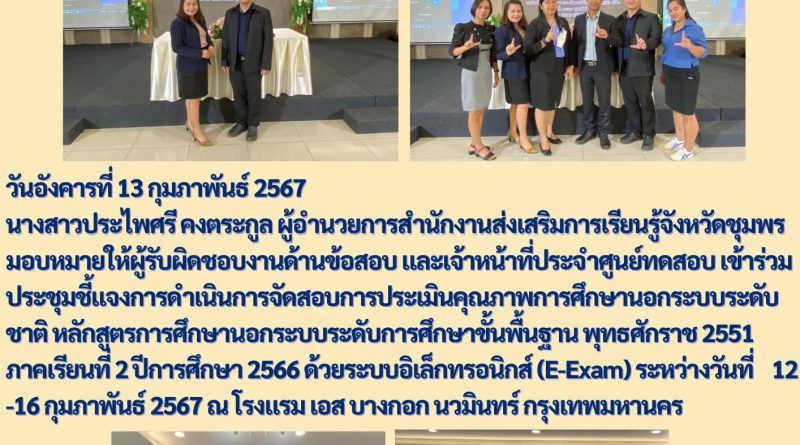 วันอังคารที่ 13 กุมภาพันธ์ 2567 นางสาวประไพศรี คงตระกูล ผู้อำนวยการสำนักงานส่งเสริมการเรียนรู้จังหวัดชุมพร มอบหมายให้ผู้รับผิดชอบงานด้านข้อสอบ และเจ้าหน้าที่ประจำศูนย์ทดสอบ เข้าร่วมประชุมชี้แจงการดำเนินการจัดสอบการประเมินคุณภาพการศึกษานอกระบบระดับชาติ หลักสูตรการศึกษานอกระบบระดับการศึกษาขั้นพื้นฐาน พุทธศักราช 2551 ภาคเรียนที่ 2 ปีการศึกษา 2566 ด้วยระบบอิเล็กทรอนิกส์ (E-Exam) ระหว่างวันที่ 12 -16 กุมภาพันธ์ 2567 ณ โรงแรม เอส บางกอก นวมินทร์ กรุงเทพมหานคร