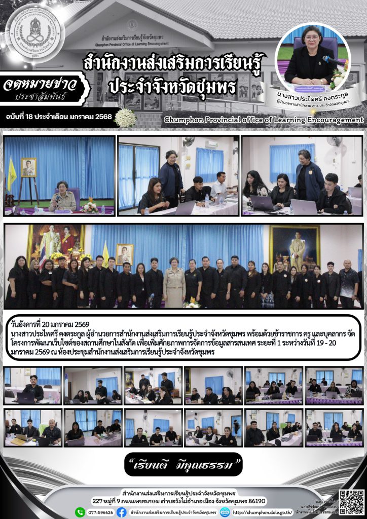 วันอังคารที่ 20 มกราคม 2569 นางสาวประไพศรี คงตระกูล ผู้อำนวยการสำนักงานส่งเสริมการเรียนรู้ประจำจังหวัดชุมพร พร้อมด้วยข้าราชการ ครู และบุคลากร จัดโครงการพัฒนาเว็บไซต์ของสถานศึกษาในสังกัด เพื่อเพิ่มศักยภาพการจัดการข้อมูลสารสนเทศ ระยะที่ 1 ระหว่างวันที่ 19 – 20 มกราคม 2569 ณ ห้องประชุมสำนักงานส่งเสริมการเรียนรู้ประจำจังหวัดชุมพร