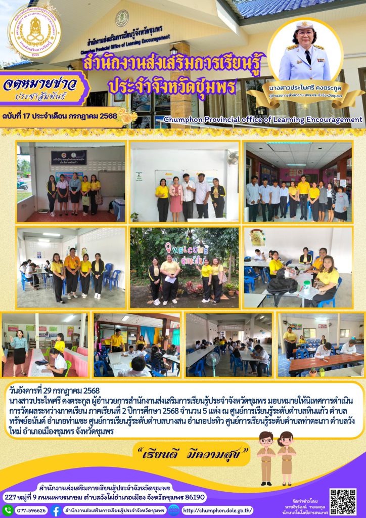 วันอังคารที่ 29 กรกฎาคม 2568 นางสาวประไพศรี คงตระกูล ผู้อำนวยการสำนักงานส่งเสริมการเรียนรู้ประจำจังหวัดชุมพร มอบหมายให้นิเทศการดำเนินการวัดผลระหว่างภาคเรียน ภาคเรียนที่ 2 ปีการศึกษา 2568 จำนวน 5 แห่ง ณ ศูนย์การเรียนรู้ระดับตำบลหินแก้ว ตำบลทรัพย์อนันต์ อำเภอท่าแซะ ศูนย์การเรียนรู้ระดับตำบลบางสน อำเภอปะทิว ศูนย์การเรียนรู้ระดับตำบลท่าตะเภา ตำบลวังใหม่ อำเภอเมืองชุมพร จังหวัดชุมพร