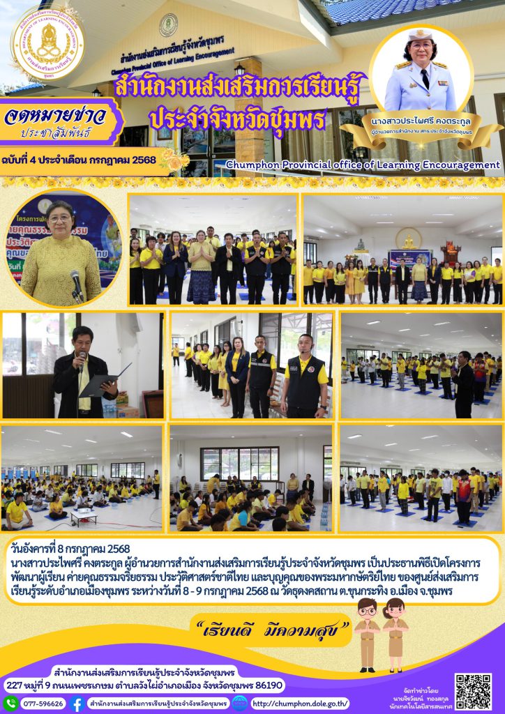 วันอังคารที่ 8 กรกฎาคม 2568 นางสาวประไพศรี คงตระกูล ผู้อำนวยการสำนักงานส่งเสริมการเรียนรู้ประจำจังหวัดชุมพร เป็นประธานพิธีเปิดโครงการพัฒนาผู้เรียน ค่ายคุณธรรมจริยธรรม ประวัติศาสตร์ชาติไทย และบุญคุณของพระมหากษัตริย์ไทย ของศูนย์ส่งเสริมการเรียนรู้ระดับอำเภอเมืองชุมพร ระหว่างวันที่ 8 – 9 กรกฎาคม 2568 ณ วัดธุดงคสถาน ต.ขุนกระทิง อ.เมือง จ.ชุมพร