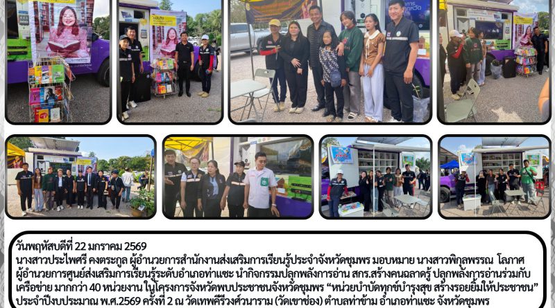 วันพฤหัสบดีที่ 22 มกราคม 2569 นางสาวประไพศรี คงตระกูล ผู้อำนวยการสำนักงานส่งเสริมการเรียนรู้ประจำจังหวัดชุมพร มอบหมาย นางสาวพิกุลพรรณ โลภาศ ผู้อำนวยการศูนย์ส่งเสริมการเรียนรู้ระดับอำเภอท่าแซะ นำกิจกรรมปลุกพลังการอ่าน สกร.สร้างคนฉลาดรู้ ปลุกพลังการอ่านร่วมกับเครือข่าย มากกว่า 40 หน่วยงาน ในโครงการจังหวัดพบประชาชนจังหวัดชุมพร “หน่วยบำบัดทุกข์บำรุงสุข สร้างรอยยิ้มให้ประชาชน” ประจำปีงบประมาณ พ.ศ.2569 ครั้งที่ 2 ณ วัดเทพคีรีวงศ์วนาราม (วัดเขาช่อง) ตำบลท่าข้าม อำเภอท่าแซะ จังหวัดชุมพร